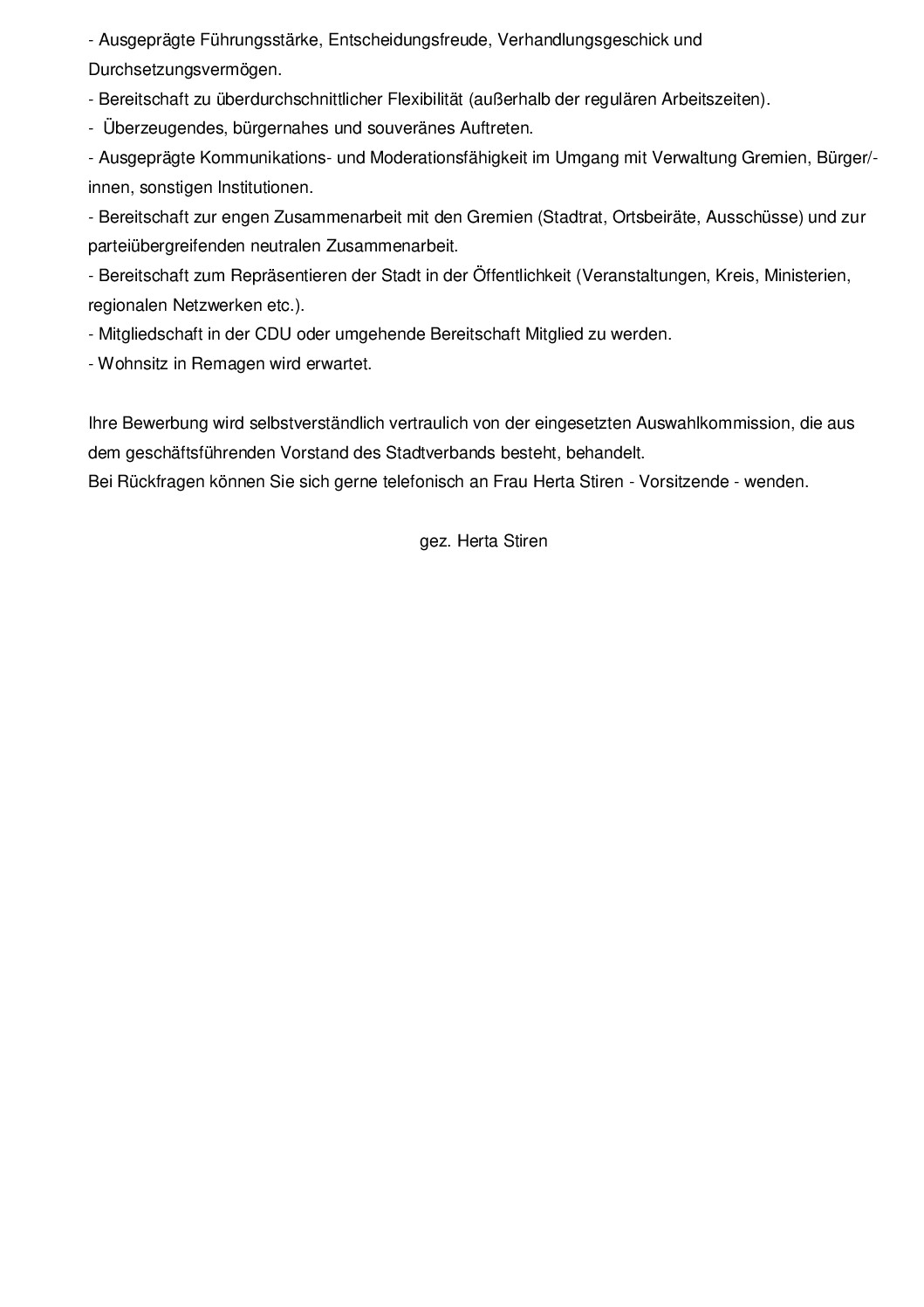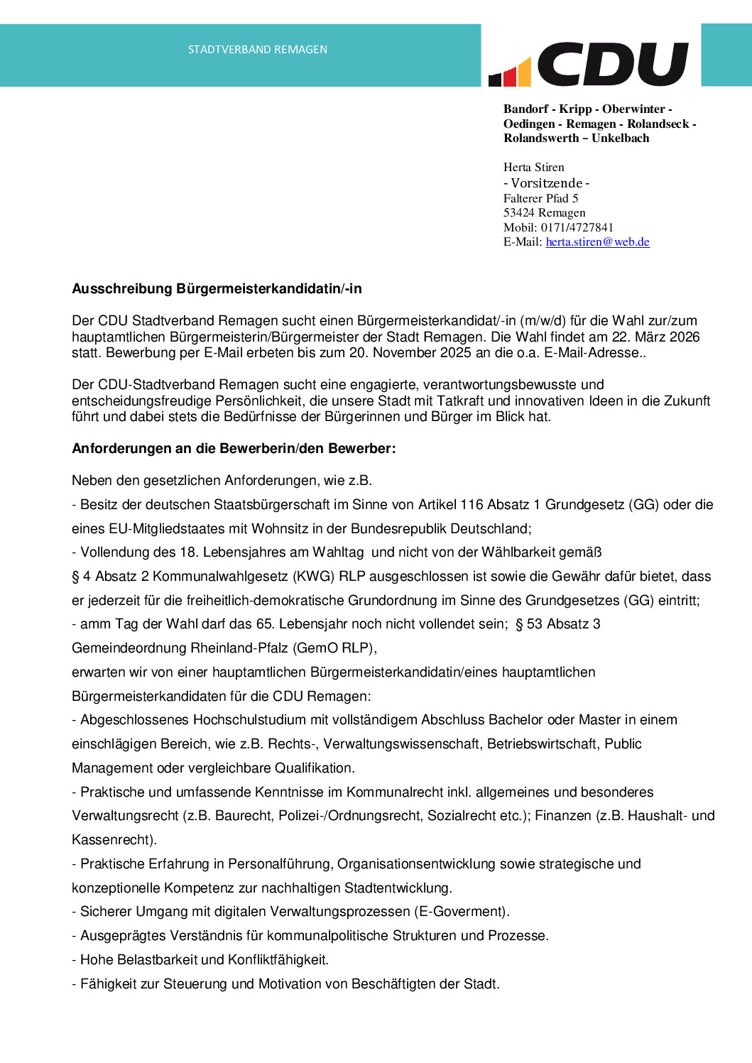 Der CDU Stadtverband Remagen sucht einen Bürgermeisterkandidat/-in (m/w/d) für die Wahl zur/zum hauptamtlichen Bürgermeisterin/Bürgermeister der Stadt Remagen. Die Wahl findet am 22. März 2026 statt. Bewerbung per E‑Mail erbeten bis zum 20. November 2025 an die o.a. E‑Mail-Adresse.. Der CDU-Stadtverband Remagen sucht eine engagierte, verantwortungsbewusste und entscheidungsfreudige Persönlichkeit, die unsere Stadt mit Tatkraft und innovativen […]